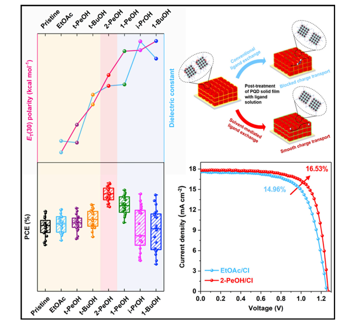 “溶剂介导配体交换”策略设计思路:溶剂甄选原则、配体交换示意图和CsPbI3量子点太阳能电池光电转换性能。