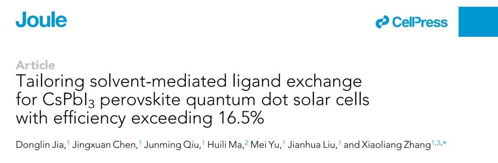(通讯员 董莹)2022年6月6日,CellPress旗下知名期刊《Joule》在线发表了44118太阳成城集团张晓亮教授课题组在钙钛矿量子点太阳能电池方面取得的最新研究进展:“Tailoring Solvent-Mediated Ligand Exchange for CsPbI3 Perovskite Quantum Dots Solar Cells with Efficiency Exceeding 16.5%”。44118太阳成城集团2019级博士生贾东霖为文章第一作者,张晓亮教授为唯一通讯作者。