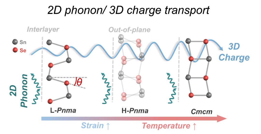 图1. n型SnSe层外3D电子-2D声子传输特性:层状SnSe晶体利用其层结构抑制了(晶格振动)声子传输,但是与声子不同的电子可通过电子轨道重叠传输实现隧穿。