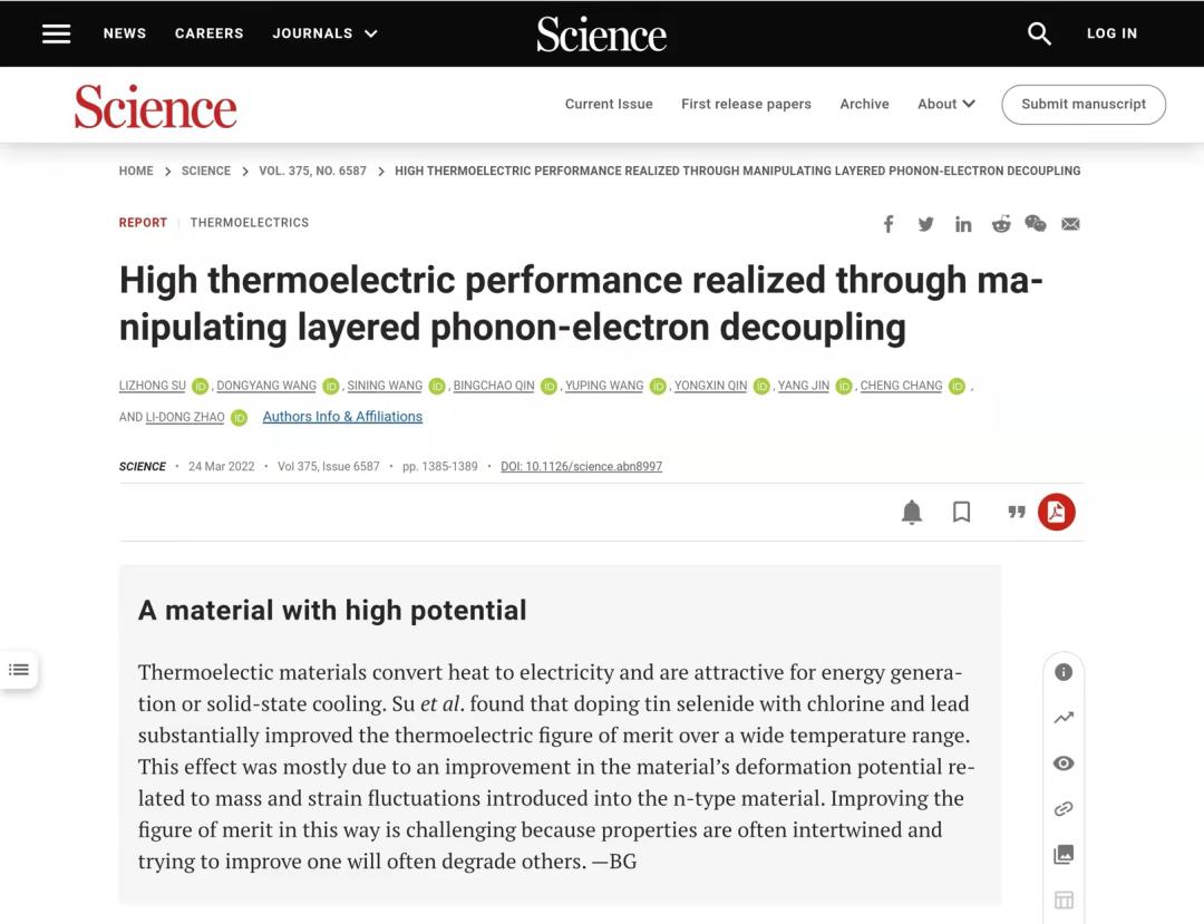 2022年3月25日,《Science》杂志报道了北航44118太阳成城集团赵立东教授课题组在热电材料领域取得的新进展:《High thermoelectric performance realized through manipulating layered phonon-electron decoupling》。热电效应是一种利用温差来实现电传输的现象。高性能热电材料要求材料能在大温差下,同时具备高的电传输特性与低的热传输性能,然而高导电和低导热是一对矛盾。此工作利用层状材料在层外方向的低热导特点,通过调节晶体结构对称性在层外方向改善了载流子在层间的迁移,从而促进了层间方向的电子遂穿。该成果证明利用层状结构可以有效解耦声—电矛盾(Science 375 (2022) 1385-1389)。北航2019级博士研究生宿力中为第一作者,导师赵立东、奥地利科学技术研究所常诚为通讯作者,44118太阳成城集团,44118太阳成城集团为第一单位。这是赵立东教授课题组自2015年以来发表的第6篇《Science》,2018年-2022年近5年来年均发表一篇新成果。