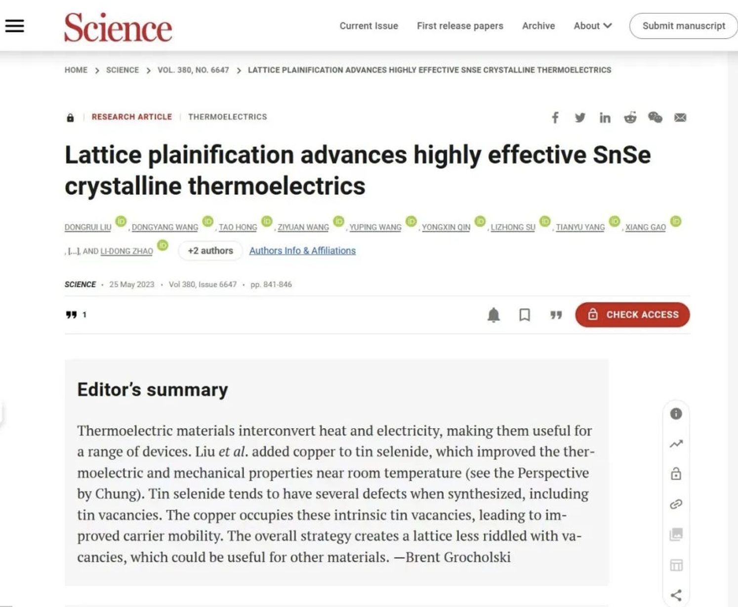 Science同期还刊登了韩国首尔大学In Chung教授的观点论文《Plainly fixing crystal lattices》,以Highlight形式对本工作进亮点报道。文中多次使用 “game-changer”、“ground-breaking”、“breakthrough”和“milestone”等形容词对本项研究工作给予了高度评价,并指出“晶格素化(lattice plainification)”策略对于新型热电制冷材料的开发和器件的优化提供了范式转变(paradigm shift),且具有里程碑意义。