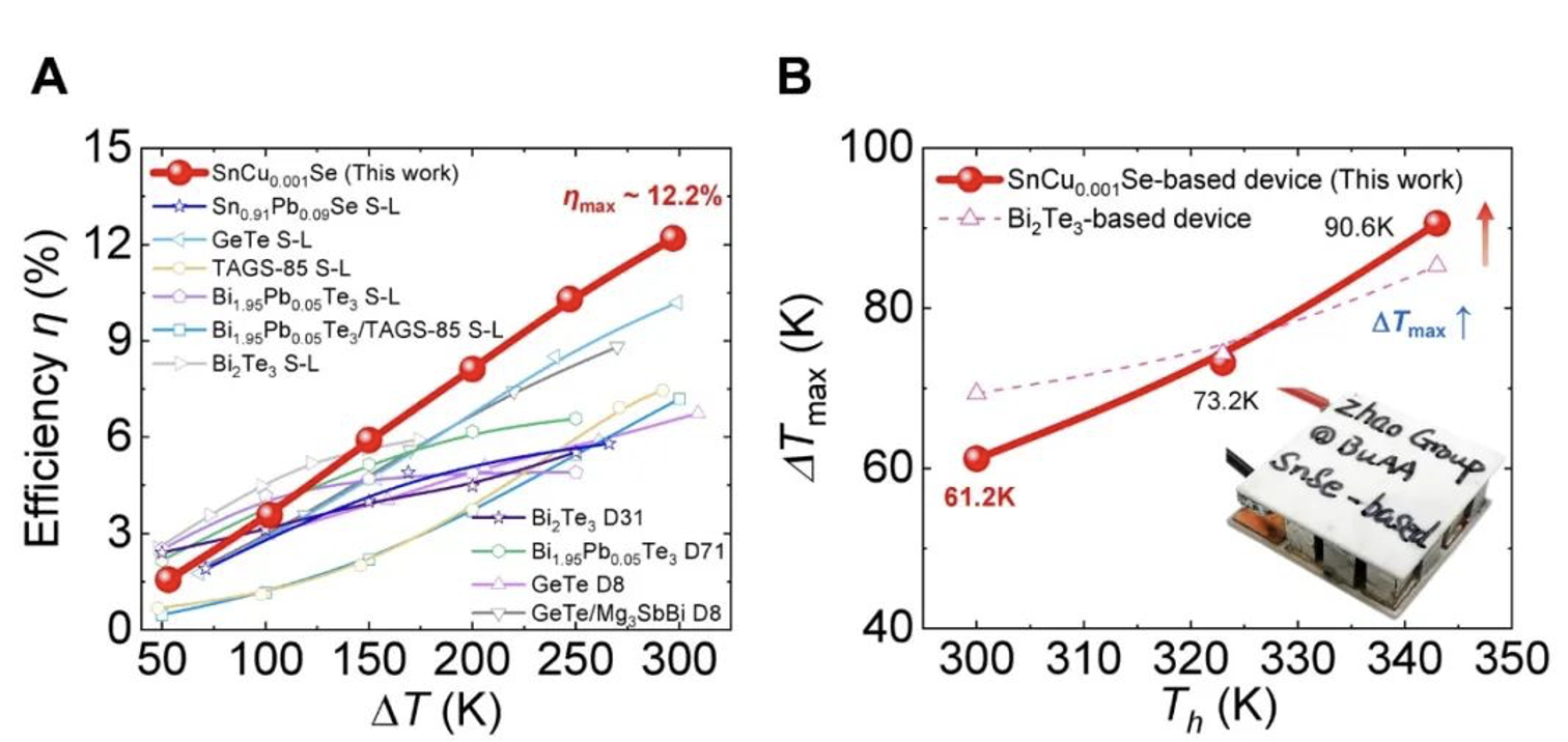 图3. (A) 发电效率对比图;(B) 基于SnSe 和Bi2Te3材料器件的制冷温差对比