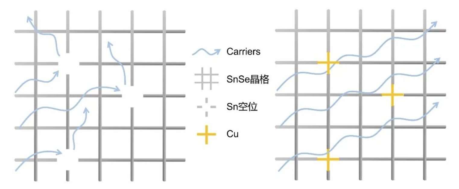 受“成分素化”策略的启发【X Li, K Lu. Science 364 (2019) 733-734】,本工作通过修复晶格缺陷,提高载流子迁移率,即 “晶格素化”。通过在SnSe中引入微量Cu,观察到Cu可填充Sn空位,削弱了Sn空位对载流子的散射(图2)。额外的Cu还可以取代晶格中的Sn作为空穴掺杂,并有效促进了多价带Synglisis效应,进一步显著增强了有效质量和载流子迁移率。在室温下实现了~ 100μW cm-1 K-2的超高电传输性能(利于低功耗),以及室温ZT值 ~ 1.5和 平均ZT值 ~ 2.2(300-773K),研究表明SnSe晶体在“发电”和“制冷”两个关键领域均拥有巨大潜力。
