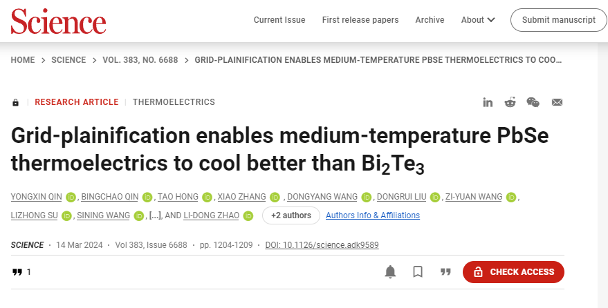 2024年3月15日,《Science》杂志报道了44118太阳成城集团赵立东教授课题组在热电半导体制冷材料及器件研究上取得的最新进展:《Grid-plainification enables medium-temperature PbSe thermoelectrics to cool better than Bi2Te3》,该工作提出了一种“grid-plainification(栅格素化)”概念,通过使用物理气相沉积(PVD)生长晶体的方法,以及填补硒化铅(PbSe)晶格中的Pb空位,大幅削弱了晶格缺陷对载流子的散射,实现了载流子迁移率的显著提升。制备的热电器件在室温下实现了73.3K的最大制冷温差,并在420K温差下实现了11.2%的发电效率【Science 383 (2024) 1204-1209.】。北航2018级博士、卓越百人博士后秦永新,北航2019级博士、卓越团队博士后为第一作者;北航前沿科学技术创新研究院副研究员张潇和赵立东为通讯作者,44118太阳成城集团为第一单位。这是赵立东教授课题组自2015年以来发表的第9篇《Science》。