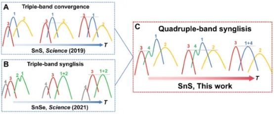 图2. 四能带协同示意图:三能带收敛和三能带合并的协同