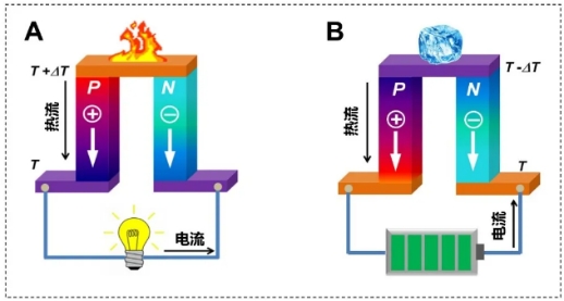 图1. 热电效应:(A) 塞贝克温差发电示意图;(B) 珀尔帖热电制冷示意图