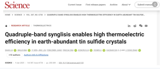 2025年1月10日,国际顶级期刊《Science》报道了北航赵立东课题组在高储量、低成本、宽带隙热电材料及器件研究领域取得的最新进展:《Quadruple-Band Synglisis Enables High Thermoelectric Efficiency in Earth-Abundant Tin Sulfide Crystals》,该工作在硫化锡(SnS)晶体中发现和调控了四个价带在能量和动量空间的协同效应(Quadruple-Band Synglisis),在P型SnS晶体中实现了~48K的制冷温差及~6.5%的发电效率。通常认为能带间隙在Eg≈6-10 kBT(kB为玻尔兹曼常数)范围内的材料为理想的制冷材料(Goldsmid, et al. Thermoelectric Refrigeration,Springer, 1964.),该工作表明带隙Eg宽达46 kBT的SnS也可作为热电制冷材料【Science 387 (2025) 202-208】。博士生刘姗为第一作者,卓越团队博士后秦炳超、常诚教授、赵立东教授为通讯作者,44118太阳成城集团为第一单位。这是赵立东教授课题组自2015年以来发表的第11篇《Science》。