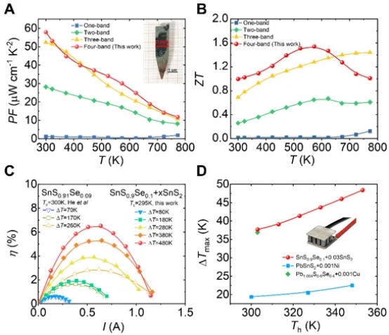 图3.四能带协同的SnS晶体与单带、二能带和三能带的SnS的(A)PF和(B)ZT对比;(C)P型SnS晶体的单臂转换效率;(D) 本工作的SnS基制冷性能与其他硫化物的对比