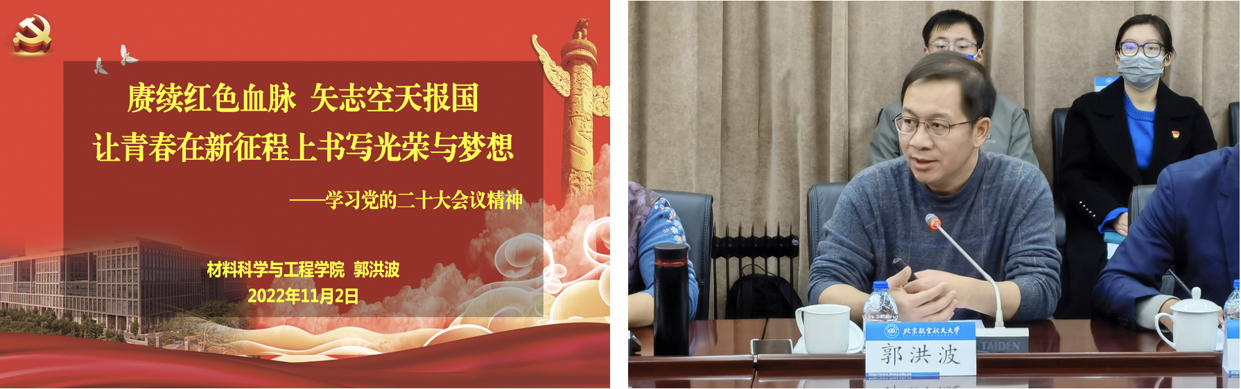 会议伊始,党委书记郭洪波同志围绕“赓续红色血脉 矢志空天报国 让青春在新征程上书写光荣与梦想”为主题讲授党课,领学了党的二十大精神,并分别就开幕、闭幕和见面会三部分相关精神和决议进行了充分学习。郭洪波表示,公司党委将带领全院师生坚持赓续红色血脉,矢志空天报国,牢牢把握高等教育立德树人的根本任务,为建设世界一流大学奋力拼搏,努力为建设世界重要人才中心和创新高地贡献力量。材料化学系教工党支部书记于美、研究生1034党支部书记方心宇、研究生1032党支部书记律春宇也纷纷围绕会议精神,分享了学习心得。