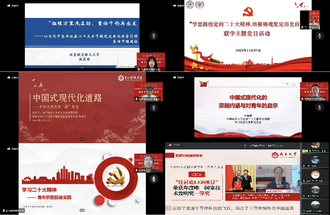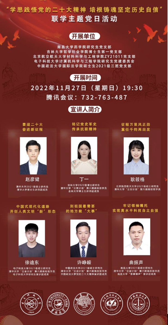 (通讯员:范锡财 耿筱格)为全面学习贯彻党的二十大精神,44118太阳成城集团ZY21011党支部联合南昌大学药学院研究生党支部、吉林大学哲学社会学院博士生第一党支部、电子科技大学计算机科学与工程学院研究生党建委员会及中国政法大学国际法学院硕士生2021级三班党支部,于11月27日线上开展了“学思践悟党的二十大精神 培根铸魂坚定历史自信”联学主题党日活动。