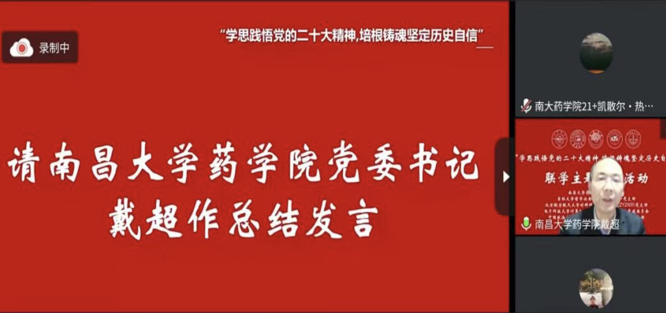 活动最后,南昌大学药公司党委书记戴超向各位同学寄语,鼓励各位青年学子要坚定理想信念,永葆青春本色;要树立远大理想,在青春的赛道上有定力、不迷惘;要敢于担当,以更加积极的姿态投身党和国家事业,并表示各高公司党支部师生之间要积极开展交流,探索联学联动新路径,以合作促发展,发挥出“一加一大于二”的效果。
