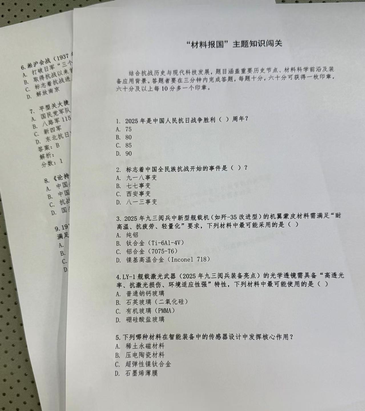 “材料报国”主题知识闯关:结合抗战历史与现代科技发展,题目涵盖重要历史节点、材料科学前沿及装备应用背景。其中房红婷、刘文霞和高原三位同学取得了满分100分的优异成绩。