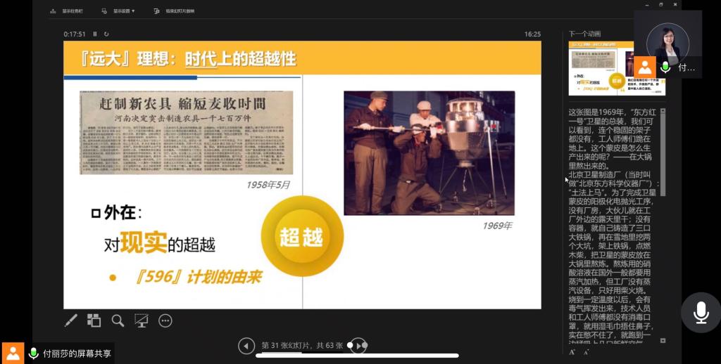 付丽莎老师用习近平总书记的话引入了本次的讲座主题:理想因其远大而为理想,信念因其执著而为信念。“两弹一星”理想远大的原因,是它具有时代上的超越性、目标上的无私性以及实践上的协同性。千年大计,一茬人接着一茬,历史中的每一位共产党人都把自己微薄的力量融入国家的事业当中。