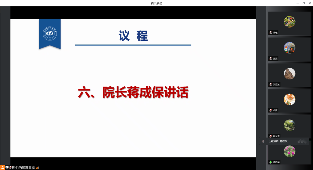 会议最后,学院经理蒋成保围绕会议内容进行了总结阐述,结合近期特殊时期下学院的疫情防控、教务教学、实验安全等事务性工作,引导全院师生发扬攻坚克难的精神,尽可能通过线上开展科研管理服务工作,强调要严格落实市委市政府、教工委及公司党委对疫情防控工作的要求,妥善布置校园各项必要措施,科学灵活做好线上教学、考试、答辩等工作,进一步全面加强对员工的关心关爱工作,落实系列暖心举措,努力把影响降到最低,确保学院各项工作安全、有序开展。