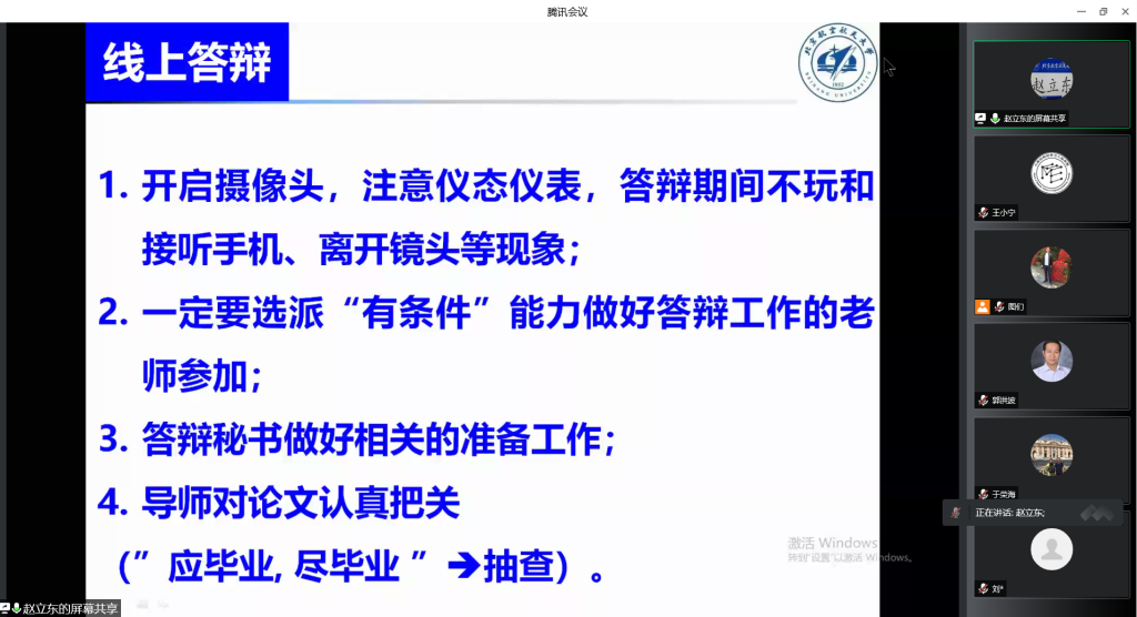 会议第三项,44118太阳成城集团副经理赵立东布置研究生教学培养相关工作,就疫情期间研究生教育培养环节,与参会老师进行了详细沟通,内容涵盖近期研究生线上毕业答辩、学院研究生线上教学课程开展以及近期线上开展科研形势下的在线指导,强调要扎实做好研究生教育培养工作。