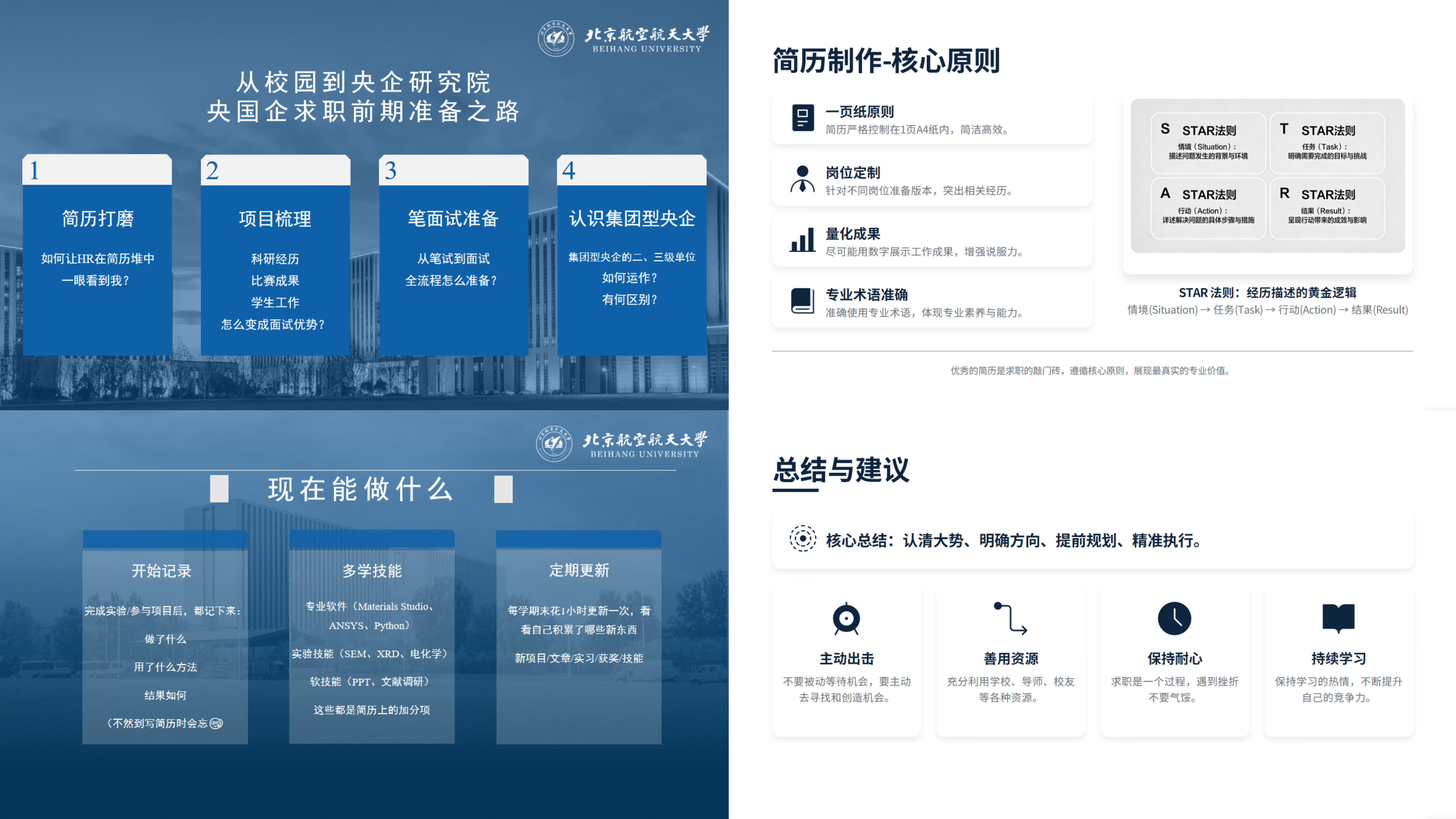 皋其源以航天系统就业为例,全面梳理材料学科五大主流就业方向,对比航空航天、新能源、半导体、先进材料、公务员及科研院所等领域的发展特点、优势与适配人群,为员工职业规划提供清晰参考。在求职实战方面,他推荐官方就业平台、行业垂直渠道、内推与实习等高效信息路径,讲解一页纸简历、STAR法则等实用技巧,并从自我介绍、项目阐述、专业知识、行为问题四个维度给出面试备战建议,助力员工掌握求职方法论。