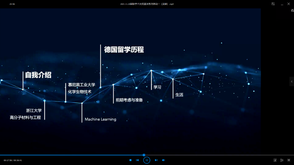 紧接着张雨琪围绕自己的德国留学历程展开详细讲解。首先她表示出国留学是想要体验不同国家的文化与科研氛围,尝试更多可能性。德国的传统制造业历史悠久、管理较为完善,有较多可以供我们学习借鉴的内容。并向同学们介绍如何使用DAAD网站查找和筛选德国相关学校与科研项目。其次张雨琪分享了到德国之后的感受:课堂内容紧紧依附于现实亟需解决的问题,例如社会可持续发展问题、环境问题等。留学期间,除学习外更要花时间去管理好自己的生活,努力找到学习、娱乐和生活的平衡点。此外还介绍了自己所在课题组的情况,表示与国内相比德国的博士更偏向于助理岗以协助导师完成相关的科研项目。