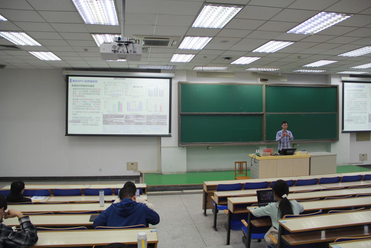 首先,马克进行了题为《连续蚕丝纤维和聚己内脂复合材料的3D打印研究》的交流分享,主要从研究背景、蚕丝与PCL的界面研究、浸渍式3D打印工艺研究、进一步研究计划四个方面进行了分享,并与同学们进行了深入交流。