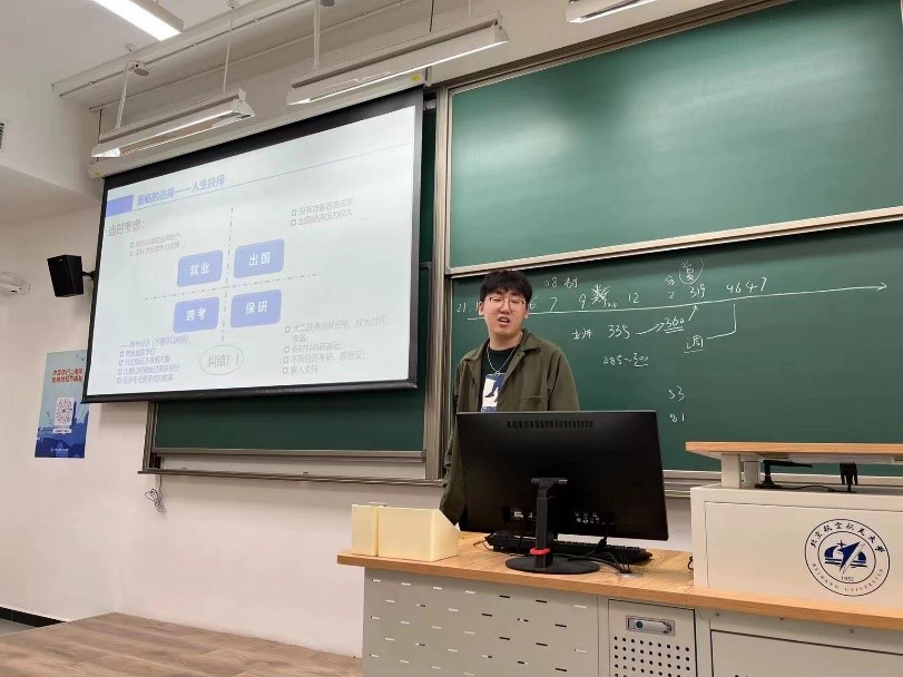 2021级硕士生肖鉴分析了2017级本科生毕业去向情况,介绍了考研、保研、出国分别需要进行的前期准备工作,建议同学们面对未来规划,正确处理焦虑心态,慎重选择职业方向,不负韶华,发愤图强。2018级本科生莫书澄结合亲身考研经历,建议同学们尽早确定专业志趣,扬长避短。随后,其余五名学长学姐依次进行了分享,他们用积极乐观、勤奋好学、勇于探索实践的精神激发了同学们拼搏奋斗的动力。